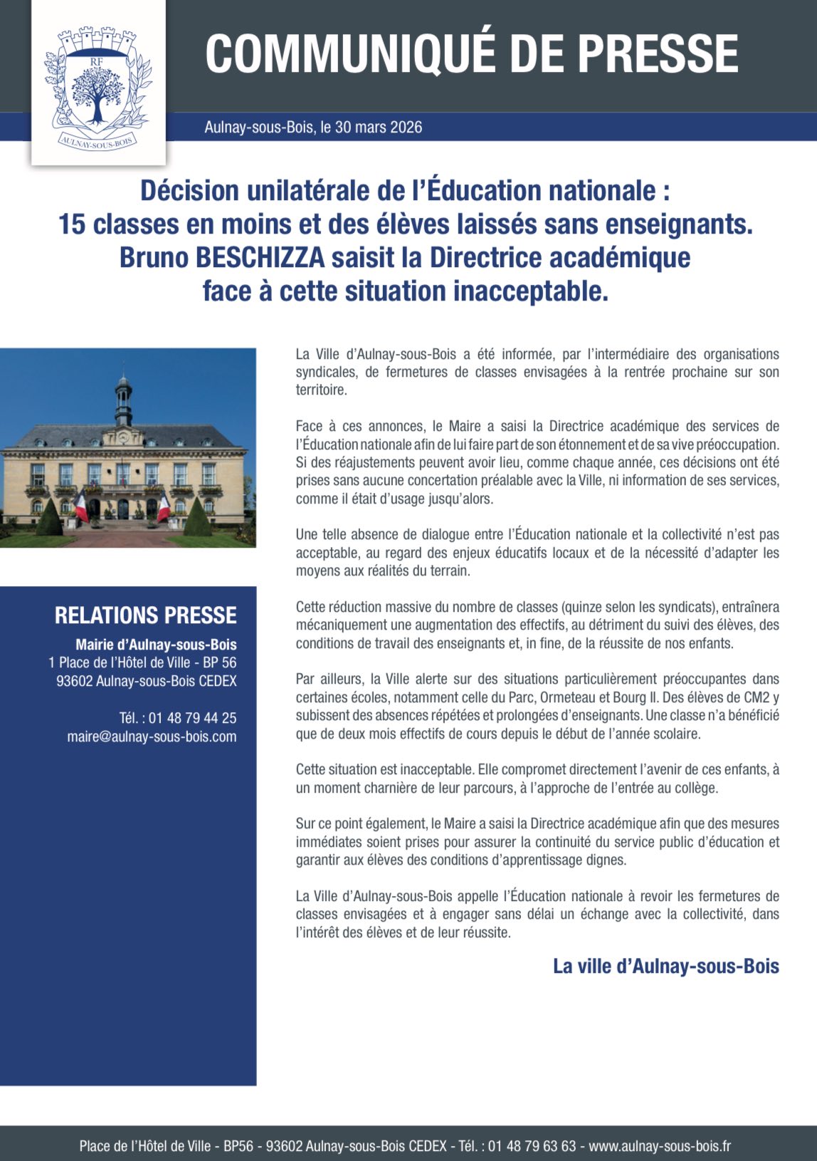 Le Maire Bruno Beschizza a saisi officiellement la Directrice académique de la Seine-Saint-Denis (DSDEN 93) pour dénoncer plusieurs situations graves qui touchent directement les écoles d’Aulnay-sous-Bois.