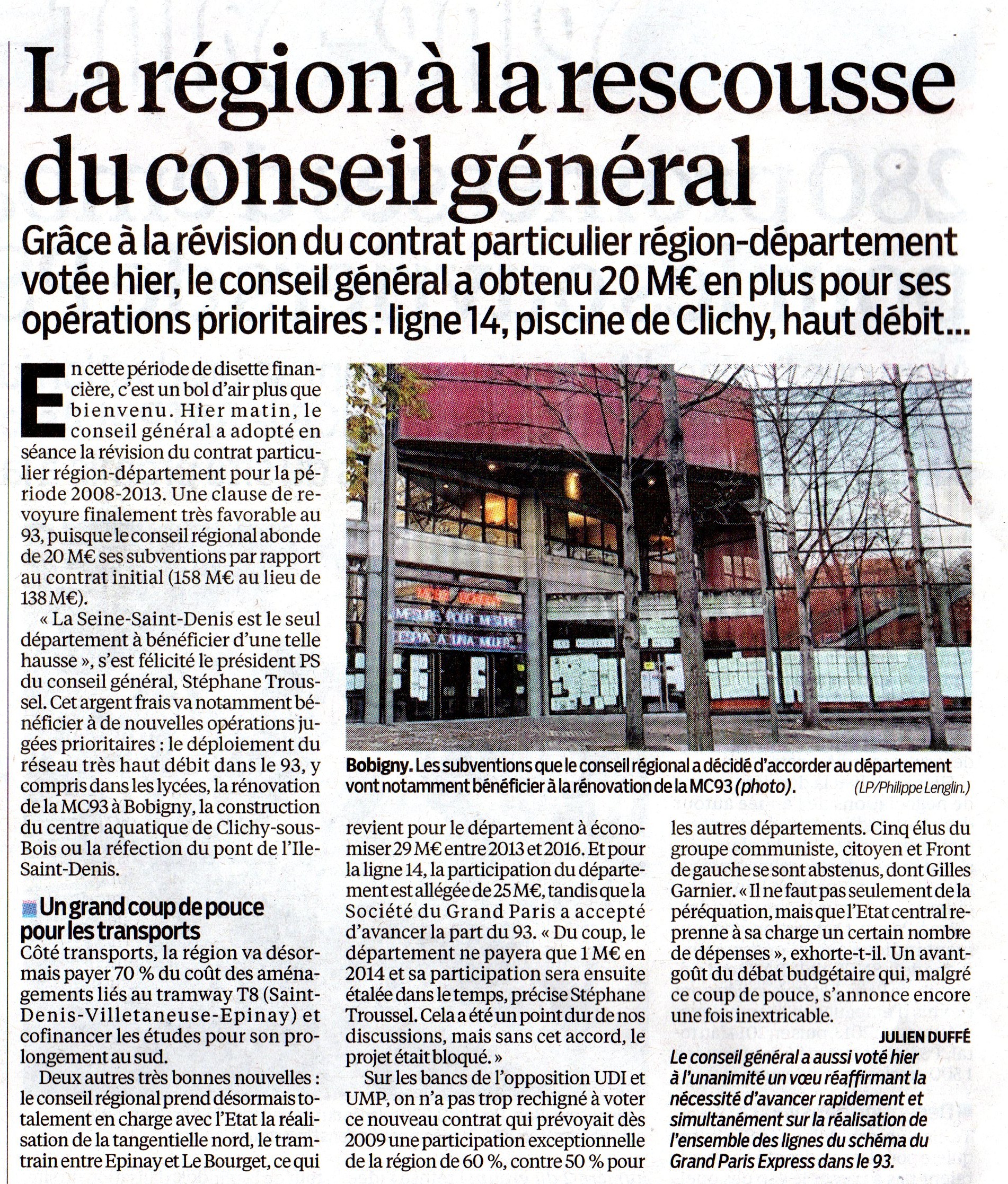 Grâce à la révision du contrat particulier région-département votée hier, le conseil général a obtenu 20 m€de plus pour ses opérations prioritaires : ligne 14, piscine de Clichy, haut débit…