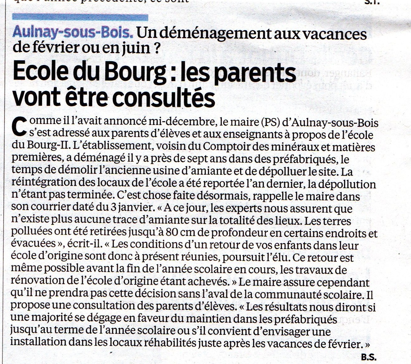 « Comme il l’avait annoncé mi-décembre, le maire (PS) d’Aulnay-sous-Bois s’est adressé aux parents d’élèves et aux enseignants à propos de l’école du Bourg-II. L’établissement, voisin du Comptoir des minéraux et matières premières, a déménagé il y a près de sept ans dans des préfabriqués, le temps de démolir l’ancienne usine d’amiante et de dépolluer le site. La réintégration des locaux de l’école a été reportée l’an dernier, la dépollution n’étant pas terminée. C’est chose faite désormais, rappelle le maire dans son courrier daté du 3 janvier. « A ce jour, les experts nous assurent que n’existe plus aucune trace d’amiante sur la totalité des lieux. Les terres polluées ont été retirées jusqu’à 80 cm de profondeur en certains endroits et évacuées », écrit-il. « Les conditions d’un retour de vos enfants dans leur école d’origine sont donc à présent réunies, poursuit l’élu. Ce retour est même possible avant la fin de l’année scolaire en cours, les travaux de rénovation de l’école d’origine étant achevés. » Le maire assure cependant qu’il ne prendra pas cette décision avant l’aval de la communauté scolaire. Il propose une consultation des parents d’élèves. « Les résultats nous diront si une majorité se dégage en faveur du maintien dans les préfabriqués jusqu’au terme de l’année scolaire ou s’il convient d’envisager une installation dans les locaux réhabilités juste après les vacances de février ».«