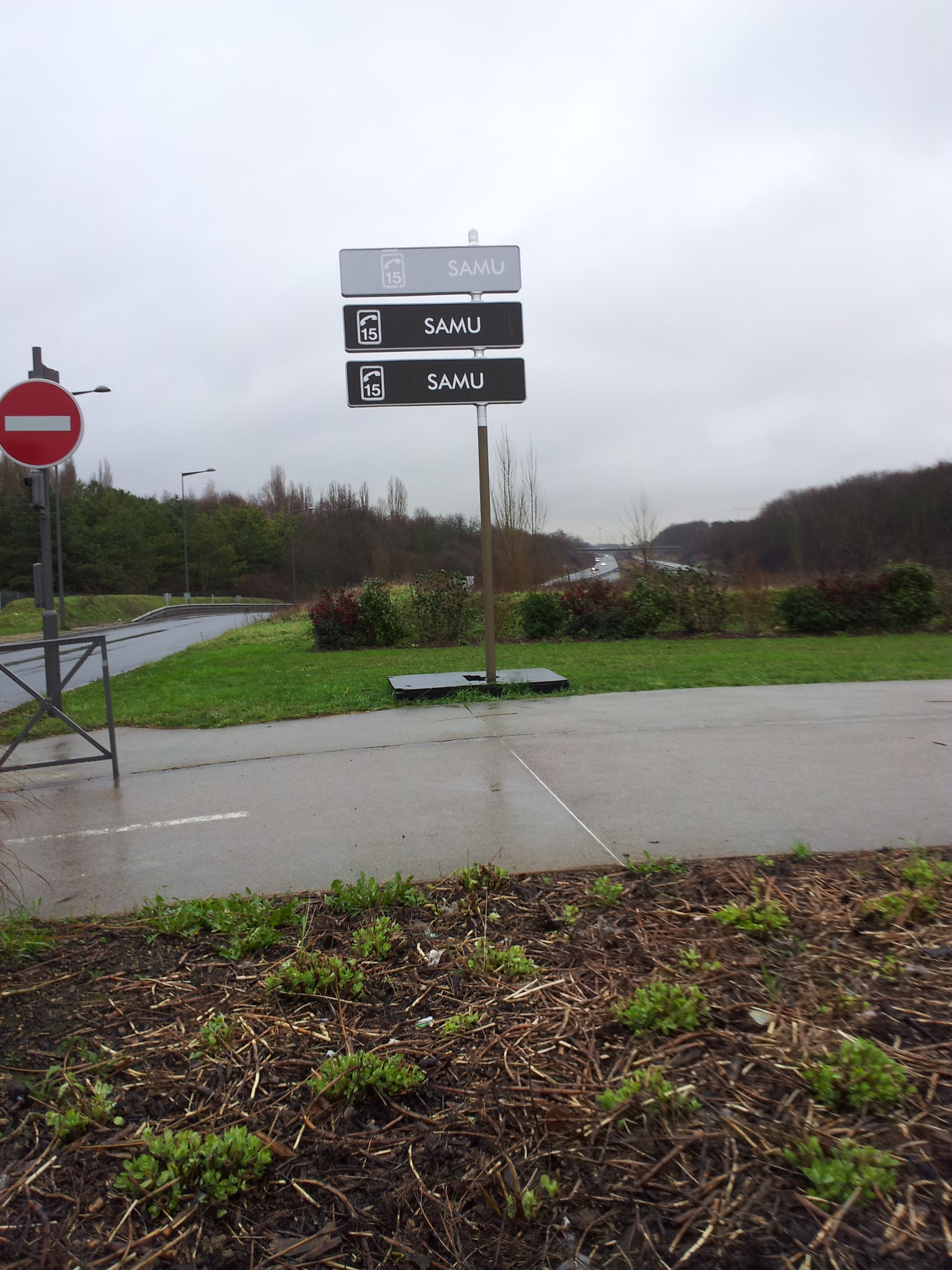 En réalité ce genre de panneau temporaire a une fonction plus précise que d’afficher 3 fois « SAMU 15 ». La face montrée ici affiche le dos de ces panneaux. A l’endroit, les panneaux indiquent la direction de restaurants et hôtels. Encore peu courants sur Aulnay, ces panneaux sont pourtant bels et bien encrés dans les meurs dans des villes telles que Rosny-sous-Bois.