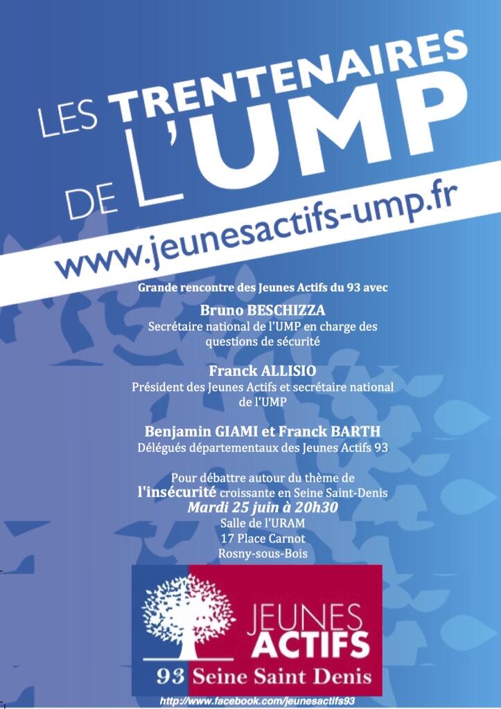 Giami_BeschizzaLes Jeunes Actifs de la Seine-Saint-Denis ont la joie de vous convier à une réunion avec Franck ALLISIO, Président des Jeunes Actifs et secrétaire national de l’UMP, le  mardi 25 juin à 20h30 à la salle de l’URAM (17 Place Carnot à Rosny-sous-Bois).