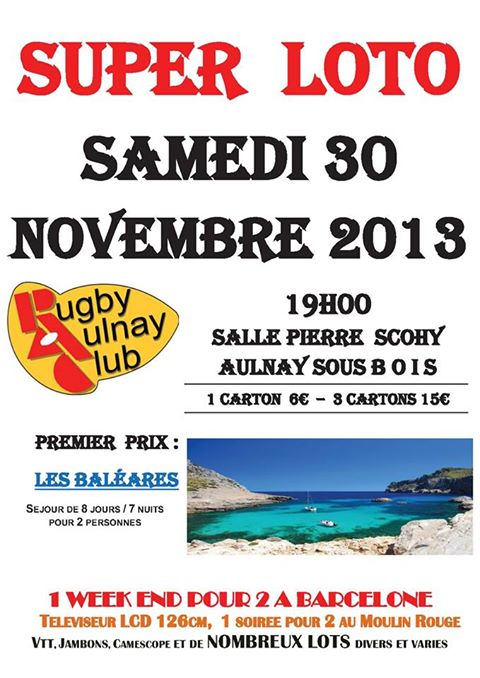 Le Rugby Aulnay Club organise, ce samedi 30 novembre, un super loto au gymnase Pierre Scohy (1 rue Aristide Briand). Le loto commence à 19h00.