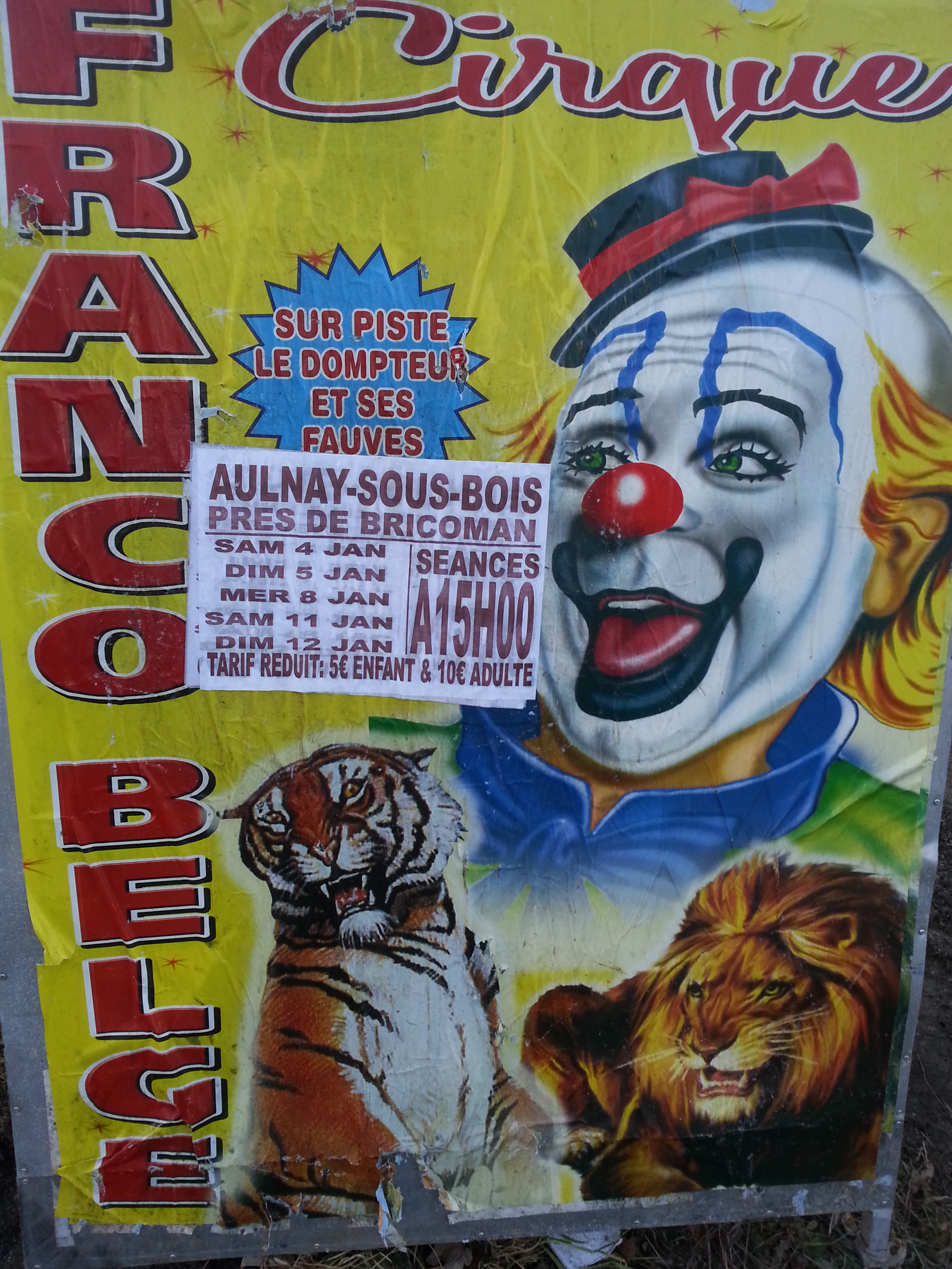 Le célèbre cirque franco-belge vient de s’installer à Aulnay-sous-Bois, près du magasin Bricoman (Savigny / Robespierre). Plusieurs camions, tentes et autres équipements de cirque sont tout à fait perceptibles. Ouverture du cirque le 4 janvier. Ce cirque devrait rester jusqu’au 12 janvier mais des prolongations sont prévues. Les séances débutent à 15h00 et sont planifiées pour :