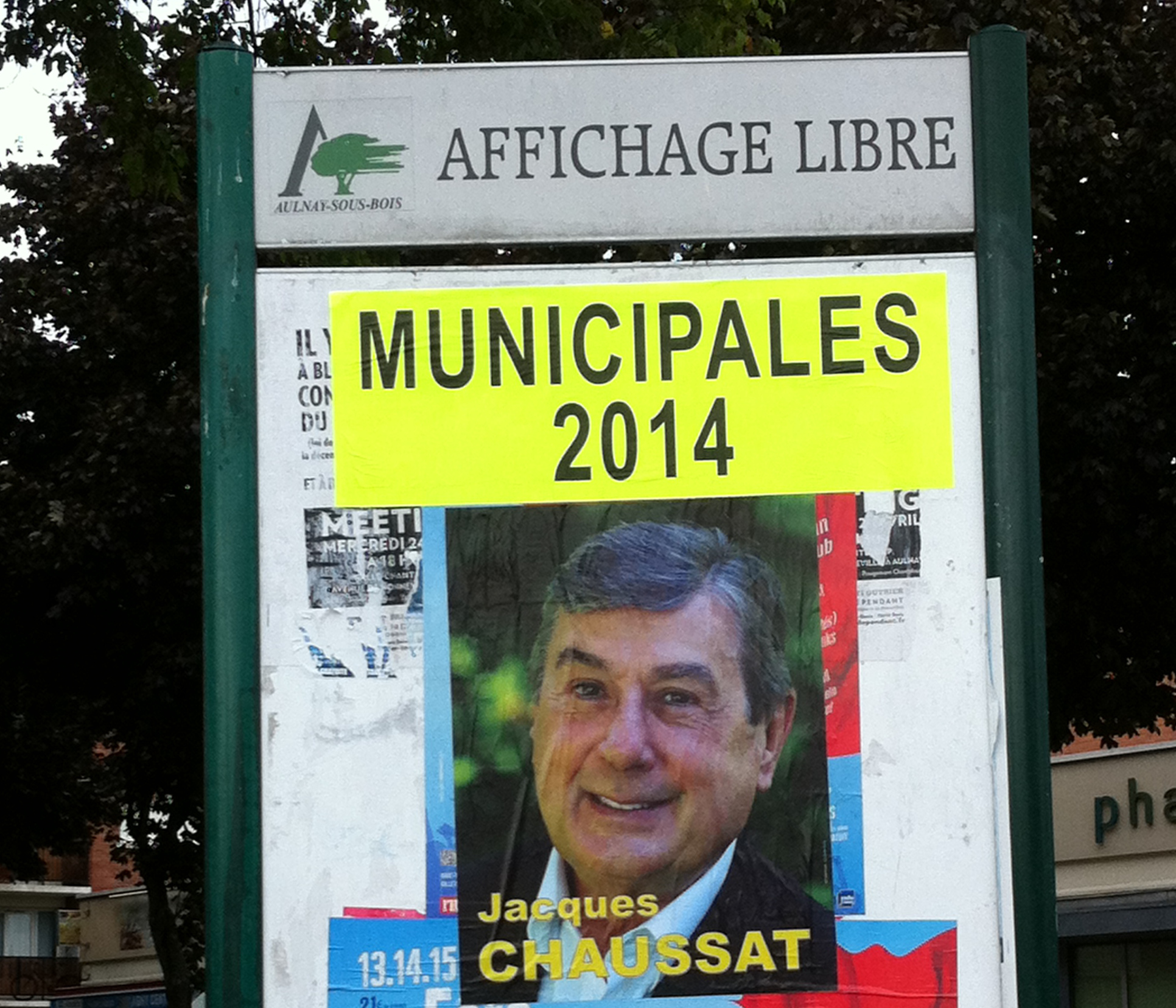 A Aulnay-Sous-Bois, un autre candidat UDI, Jacques CHAUSSAT a rajouté un grand bandeau Jaune FLUO pour attirer l’attention sur l’évènement proprement dit « MUNICIPALES 2014 »