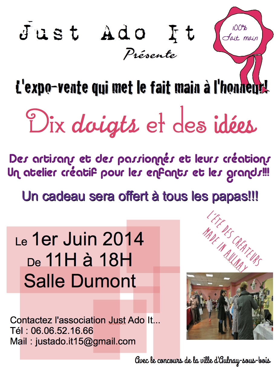 Pour rappel, l’association Just Ado It organise une exposition-vente, salle Dumont (boulevard Galliéni) ce dimanche 1er Juin. Cette exposition s’intitule « Dix doigts et des idées« . Au programme :