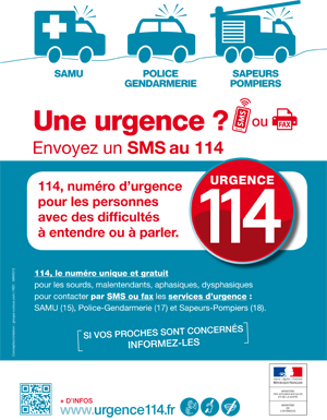 En effet, la personne ayant des difficultés à entendre ou à parler, lorsqu’elle se retrouve en situation d’urgence, qu’elle soit victime ou témoin, peut désormais, 24h/24, 7j/7, alerter et communiquer par SMS ou par fax via un numéro national unique et gratuit : le 114.