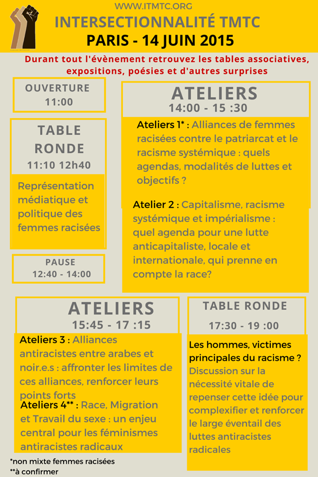 - 15h45 – 17h15 : Ateliers (Alliances antiracistes arabes et noirs ; Race, migration et travail du sexe)