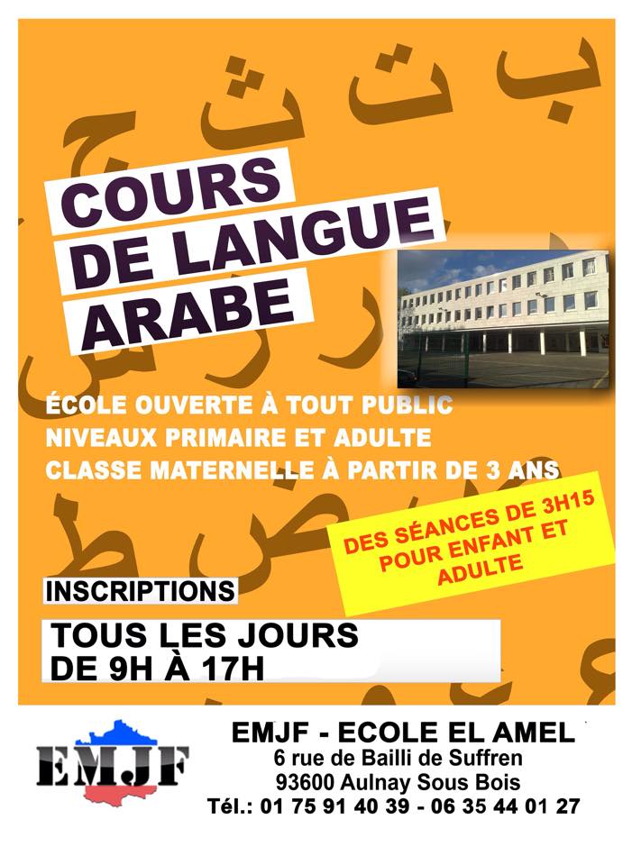 emjf_el_amelL’École El Amel, portée par l’Espérance Musulmane de la Jeunesse Française (EMJF)dispense des cours d’arabe et cela pour tous les niveaux. Elle s’appuie sur des professeurs expérimentés. Elle est implantée dans l’ancien groupe scolaire Bougainville.