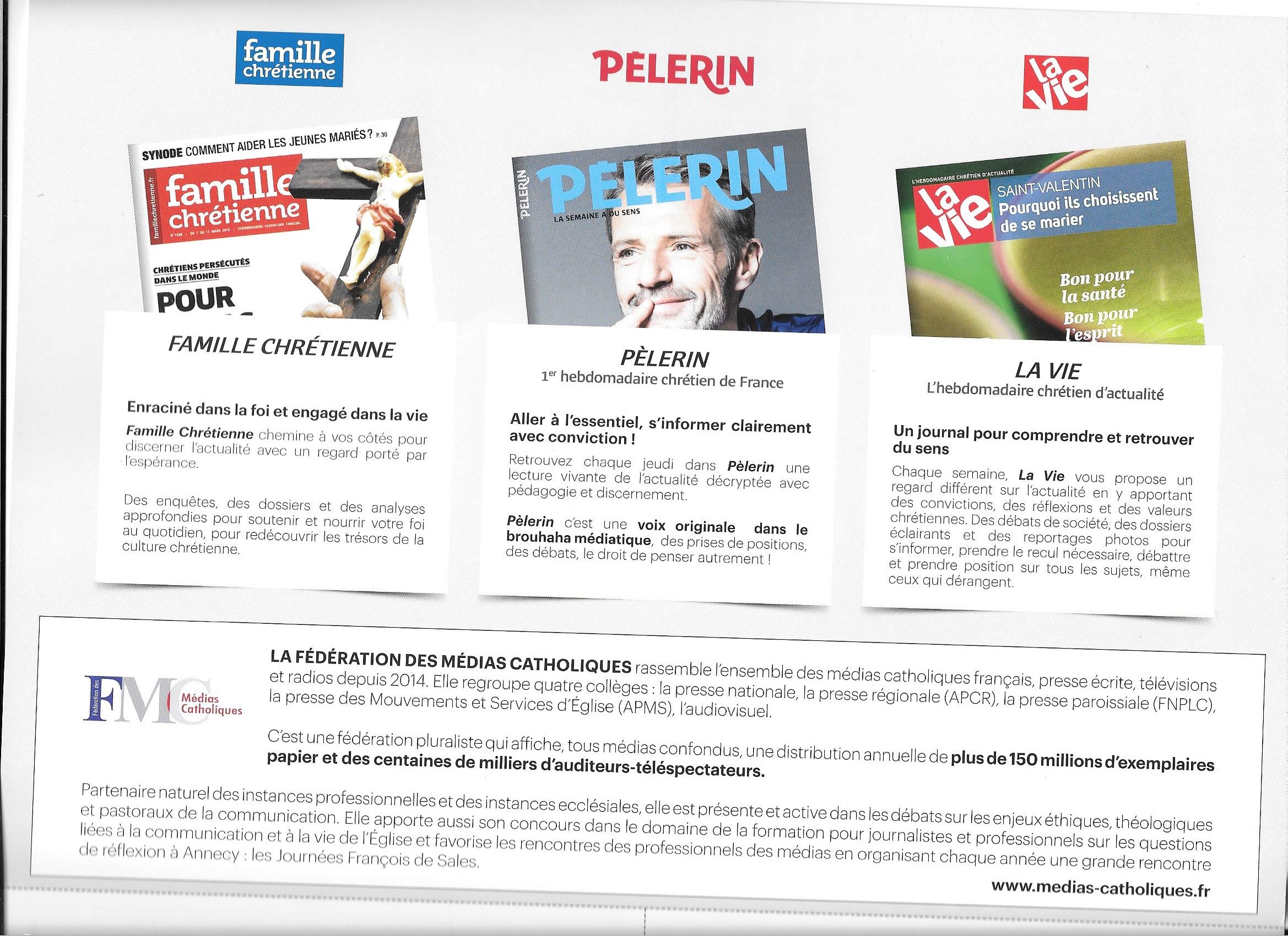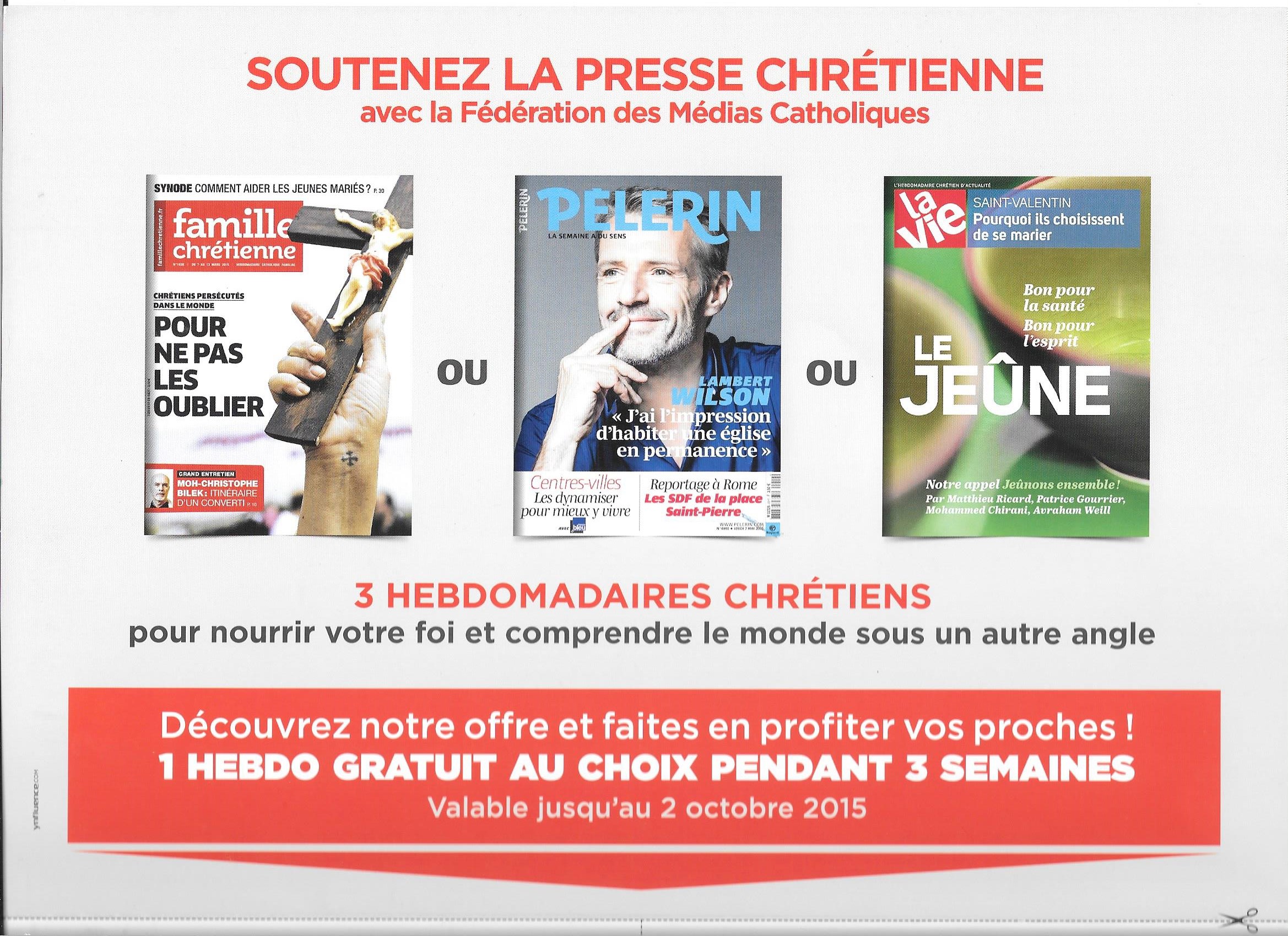 Pour découvrir la presse chrétienne, nous vous suggérons de consulter ce site: http://www.médias-catholiques.fr