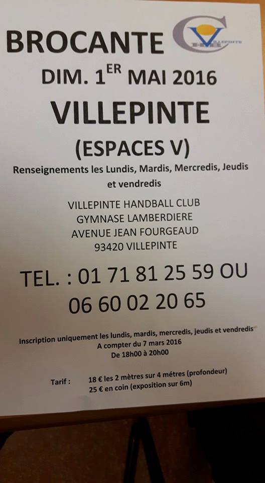 Le club de handball de Villepinte organise sa brocante le 1 mai 2016. Inscription les lundi,mardi,mercredi,jeudi,vendredi de 18h00 a 20h00.