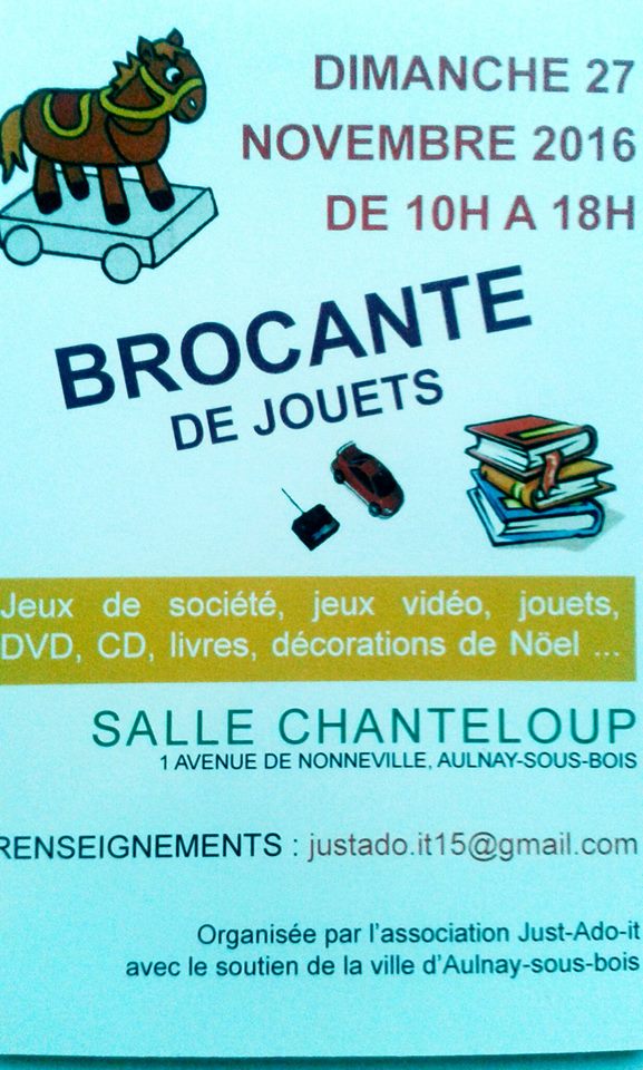 Une brocante de jouets est organisée par l’association « just ado it » avec le soutien de la ville d’Aulnay-sous-Bois le dimanche 27 novembre 2016 .