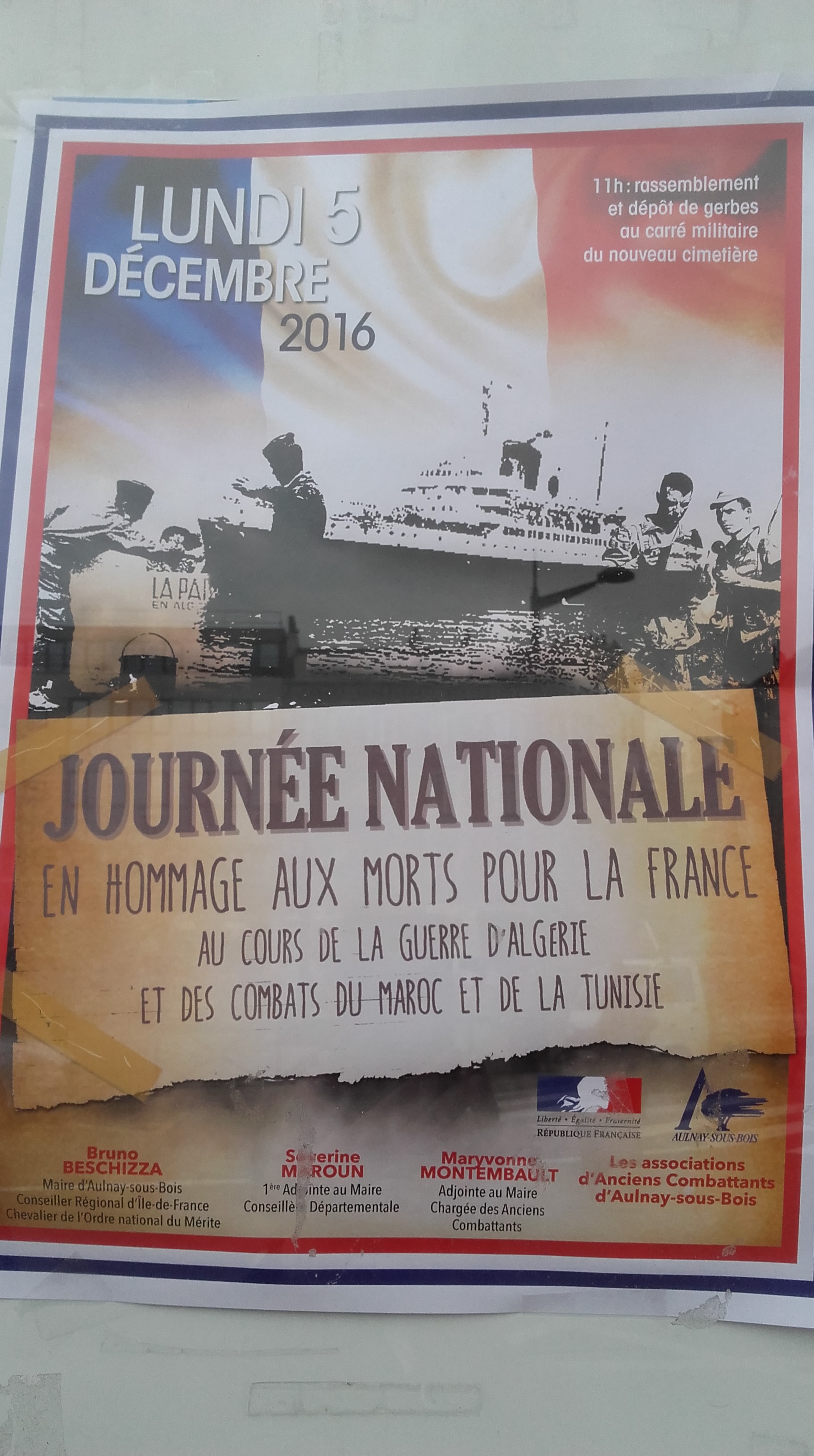 à 11 heures pour un Rassemblement et dépôt de gerbes au carré militaire du nouveau cimetière d’Aulnay-Sous-Bois, 156 route de Mitry.