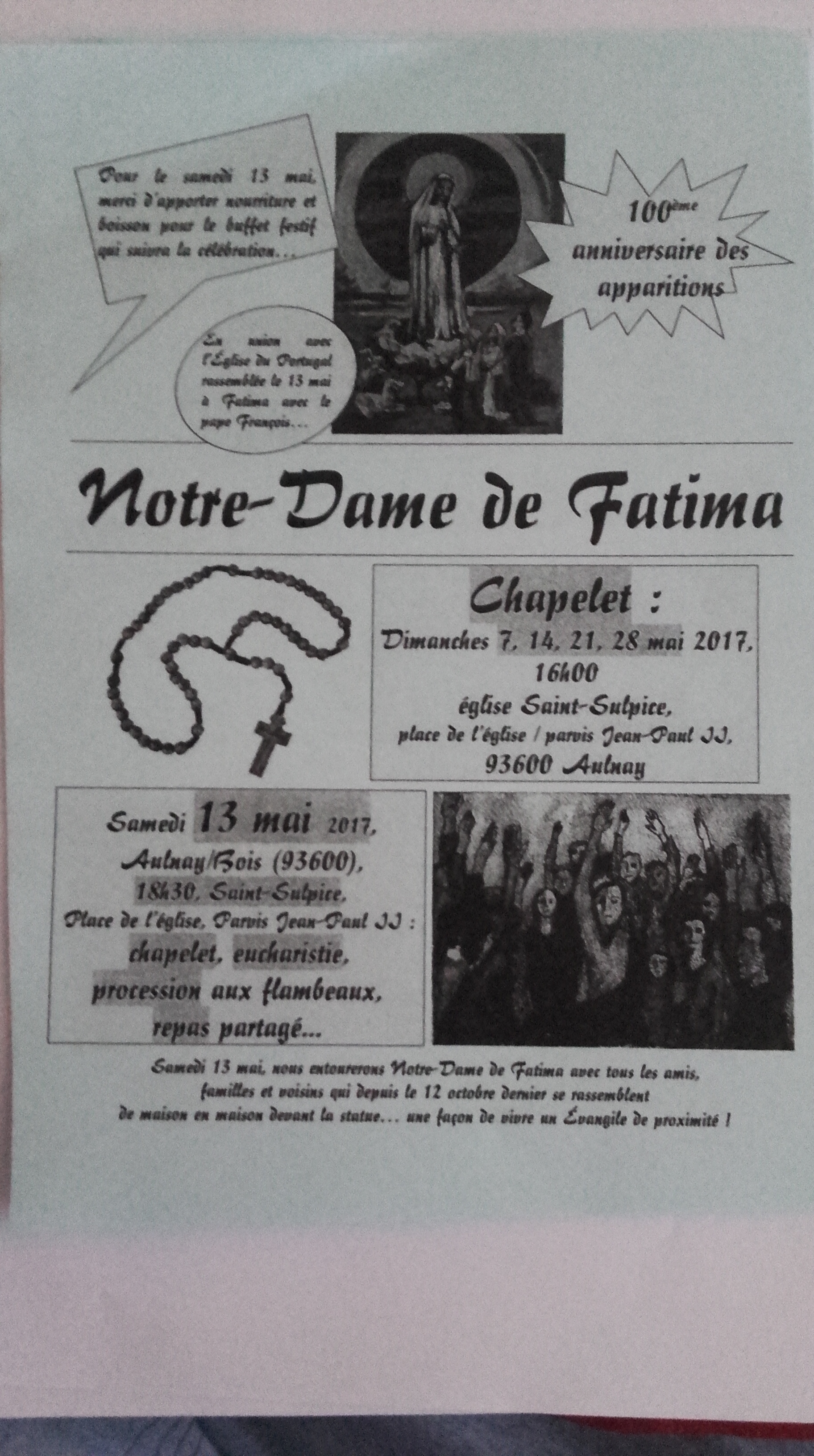 Le samedi 13 mai 2017 à 18 h 30 auront lieu : chapelet, Eucharistie, procession aux flambeaux, repas partagé, chacun apportant nourriture et boissons pour le repas festif qui suivra la célébration…