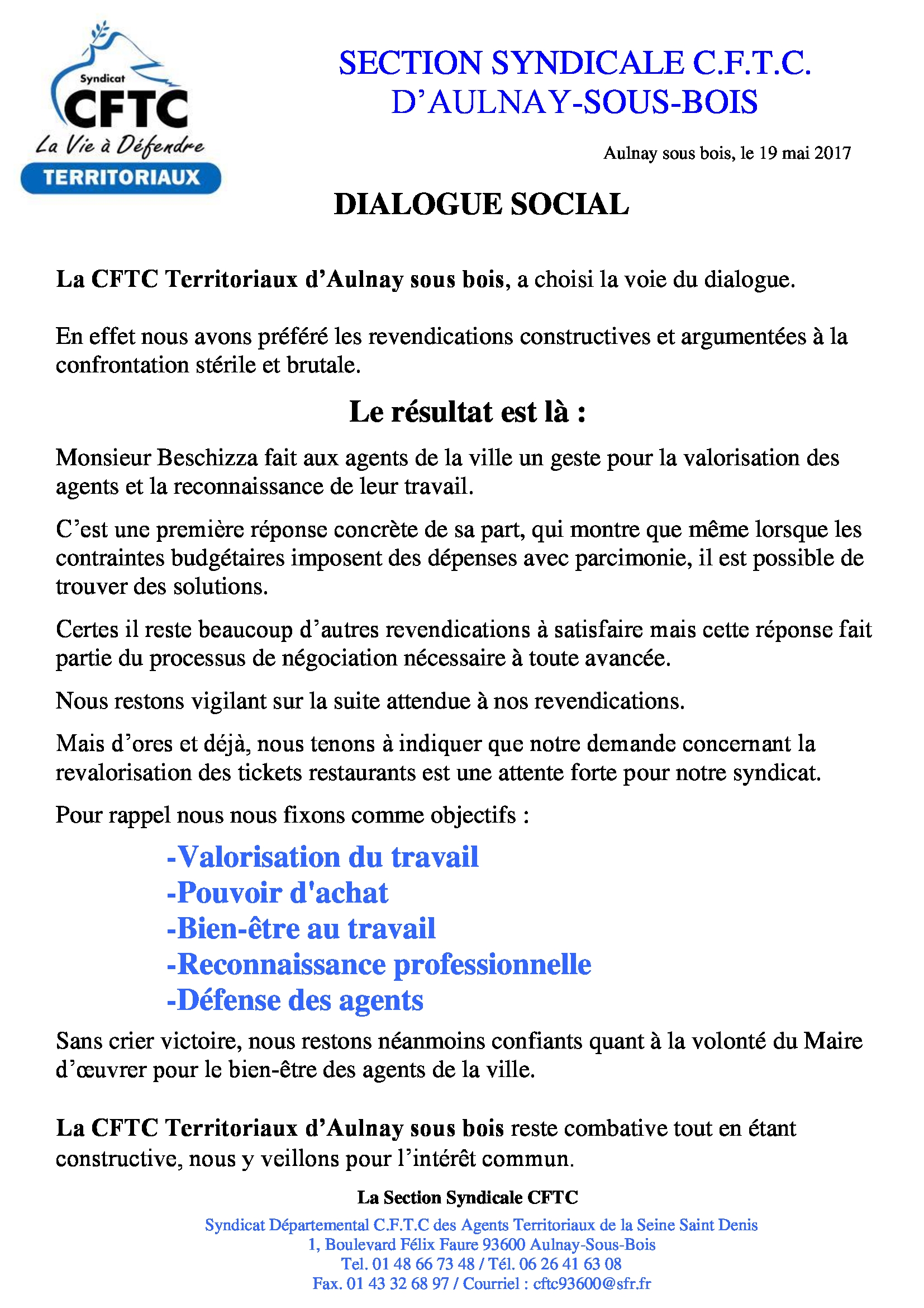 La CFTC des Territoriaux d’Aulnay se félicite que le Maire d’Aulnay réponde favorablement aux revendications du syndicat. Vous pouvez consulter le communiqué de la CFTC en cliquant sur l’image ci-contre.