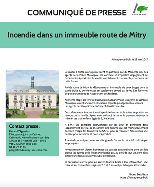 Communiqué de presse municipal suite à l’incendie de la route de Mitry à Aulnay-Sous-Bois