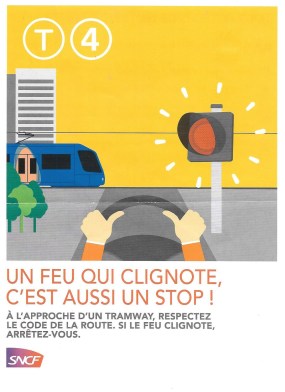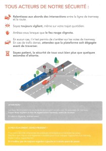 une signalétique simple et impactante a été installée pour rappeler aux automobilistes la présence des trams à proximité. Sans perturber la visibilité ni du tram ni du carrefour, cette signalétique prévient les automobilistes du potentiel danger de jour comme de nuit grâce à un système de pictogramme réfléchissant. Pour rappeler à tous l’importance du respect de la signalisation en place, les abris-quai des principales stations de la ligne ont également été habillés avec le visuel clé de la campagne « Un feu qui clignote, c’est aussi un stop ! ».