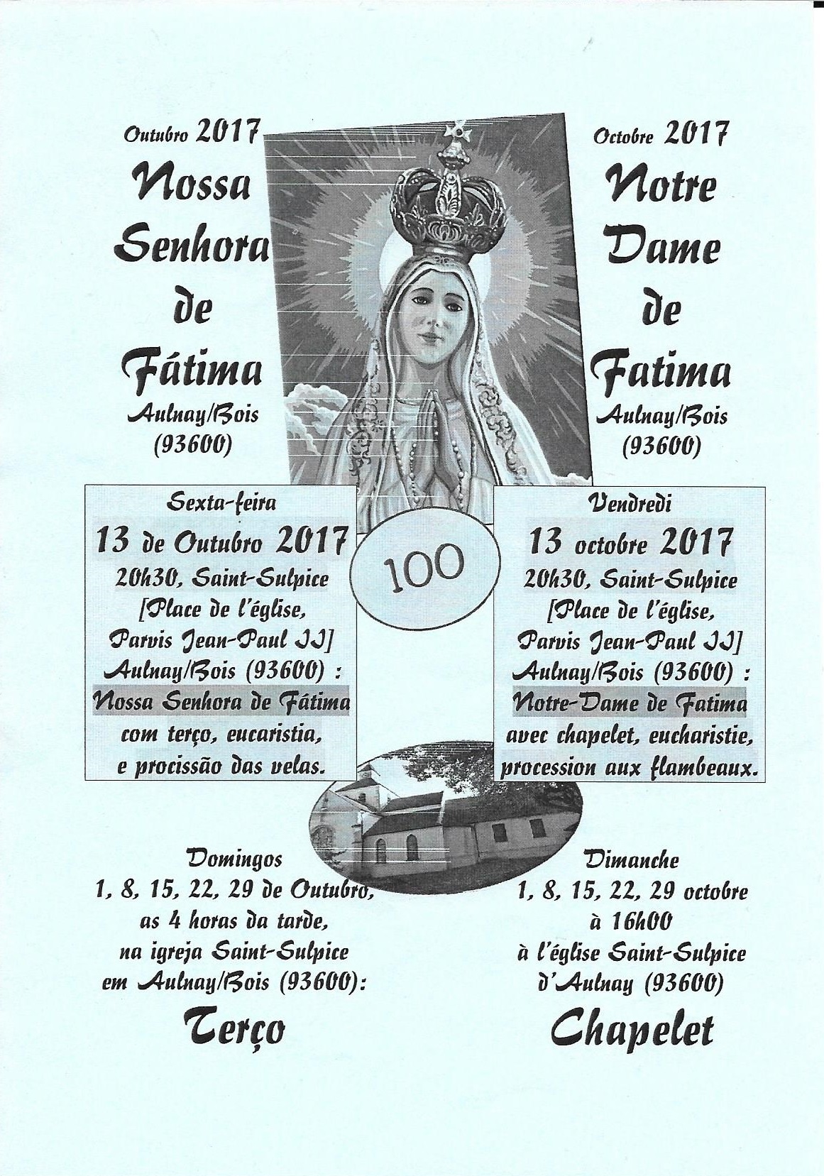 Pour clôturer l’année jubilaire du centenaire des apparitions de Notre-Dame de Fatima, en portugais comme en français, nous sommes invités à nous retrouver vendredi 13 octobre à 20h30 à Saint-Sulpice d’Aulnay(93600)… avec également l’invitation à vivre un chapelet communautaire chaque dimanche d’octobre (voir pièce jointe)…