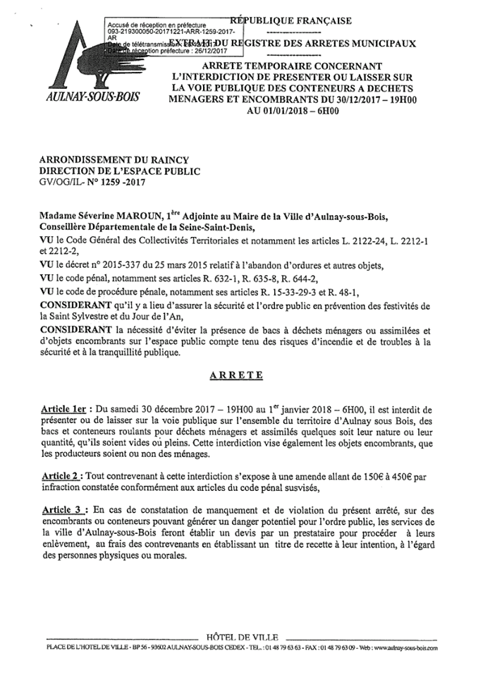 Du samedi 30 décembre à 19h au 1er janvier 2018 à 6h, il est interdit de sortir ou de laisser sur les trottoirs les bacs et conteneurs à déchets ménagers ainsi que les encombrants, afin de limiter les risques d’incendie et de troubles à l’ordre public.