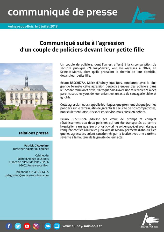 Communiqué du maire d’Aulnay-Sous-Bois sur l’agression d’un couple de policiers devant leur petite fille