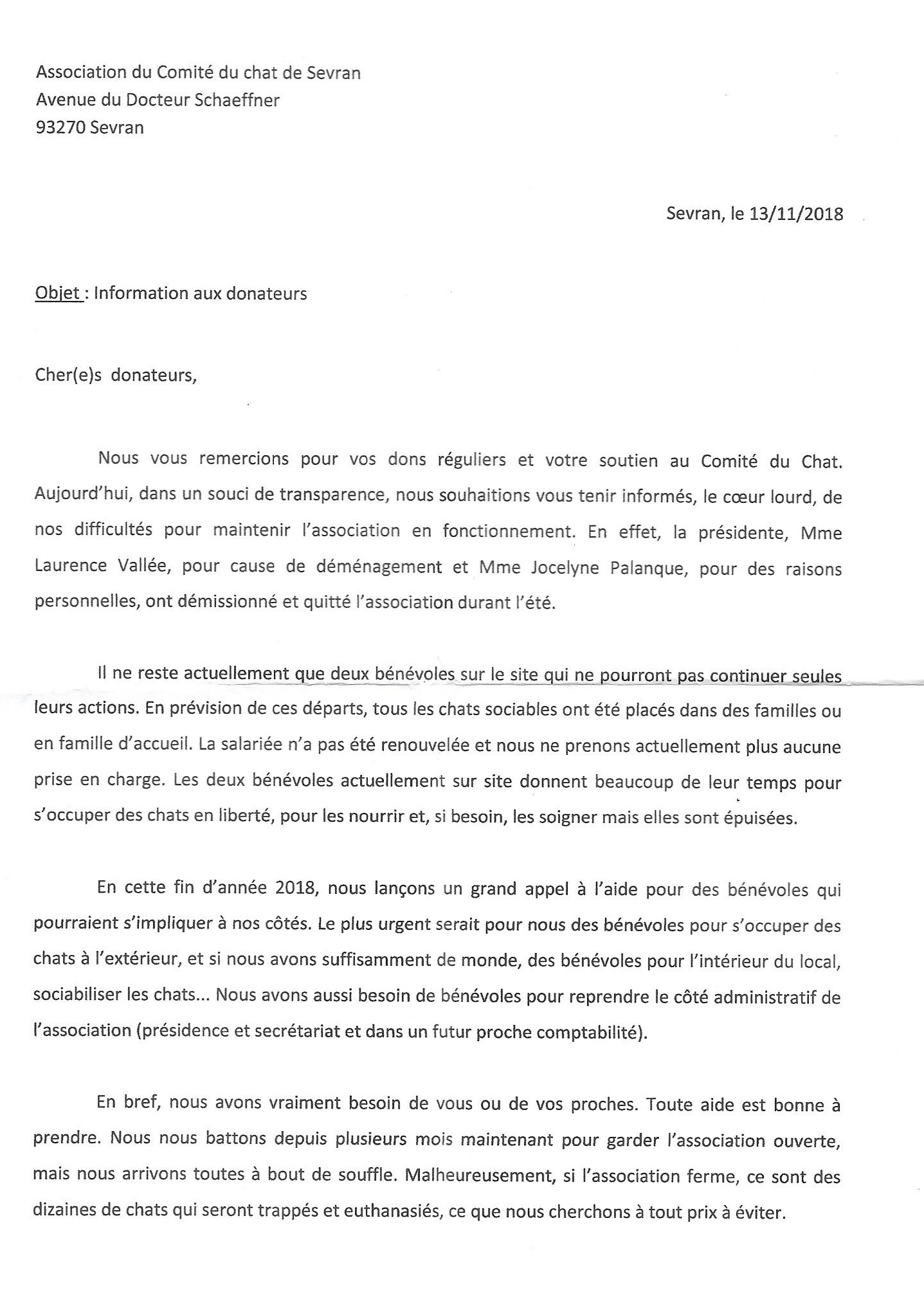 Il recherche des bénévoles pour l’interieur du local, sociabiliser les chats, reprendre le côté administratif de l’association ( présidence et secrétariat et dans un futur proche comptabilité)