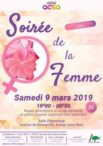 Inscription à la « soirée de la femme de l’Acsa » du 9 Mars ce vendredi 1 mars à partir de 18h30 à l’antenne Albatros de la Bourdonnais.