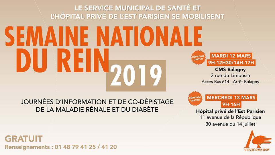 La Semaine nationale du rein, la Ville d’Aulnay-sous-Bois et l’Hôpital privé de l’Est parisien, avec le soutien de l’Agence régionale de santé (ARS) et des associations Renif et France Rein, organisent deux journées d’information et de co-dépistage du diabète et des maladies rénales