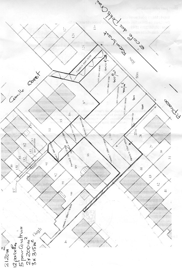 D’après le plan ci-joint transmis à des riverains mitoyens au parc, ces 2120 m2 seraient partagés en lots à vendre, 7 proposés aux propriétaires de pavillons en prolongation de leur terrain et 5 plus grands pour construire de nouveaux pavillons ou… ?