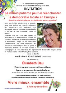 Élisabeth Dau est l’une des figures du renouveau de la démocratie en Europe, en travaillant la question du municipalisme dans le Mouvement Utopia et en conseillant CommonsPolis. Elle nous expliquera les processus démo-cratiques mis en place à Barcelone, Saillans et Grenoble qu’elle a accompagnés et nous présentera des représentants de collectifs citoyens en Île-de-France, dont le collectif Aulnay Bien Commun.
