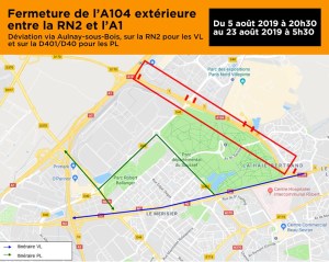 Du 5 au 23 août 2019, l’A104 extérieure sera fermée à la circulation entre la RN2 et l’A1 en raison de travaux de réfection de la chaussée.