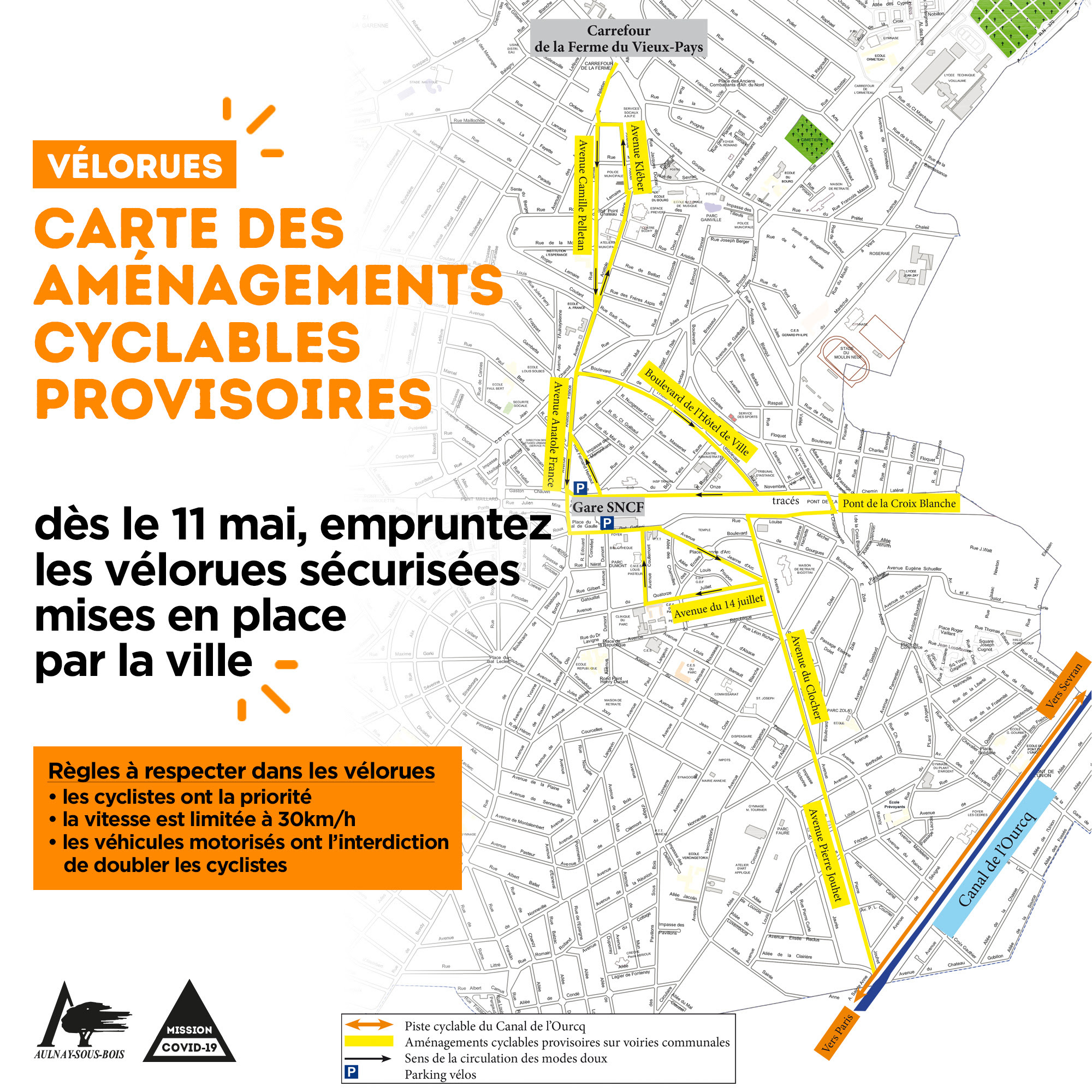 Dans le cadre du déconfinement sanitaire lié à l’épidémie de COVID-19, la Ville d’Aulnay-sous-Bois met en place des aménagements cyclables sécurisés et innovants pour faciliter les déplacements des Aulnaysiennes et des Aulnaysiens qui doivent reprendre le travail et qui veulent éviter les transports en commun.