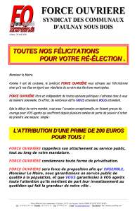 FORCE OUVRIÈRE sera force de proposition afin qu’ ENSEMBLE, Monsieur Le Maire, nous garantissions un service public de qualité à la population, et que VOUS garantissiez à VOS agents toute l’attention qu’ils méritent de part leur investissement au quotidien qui fait la grandeur de notre ville.