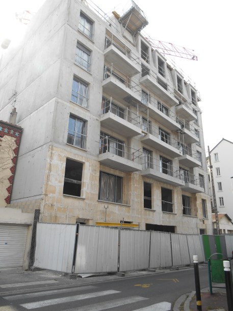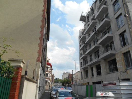 Sur la photo qui suit vous constaterez qu’en plus du non alignement de l’immeuble avec les pavillons existants, comme dans la rue Anatole France, les balcons surplombent le trottoir déjà bien étroit …. Les Aulnaysiens se sont pourtant exprimé sur le recul des constructions de la voie publique et sur le refus des balcons au dessus de l’espace publique !