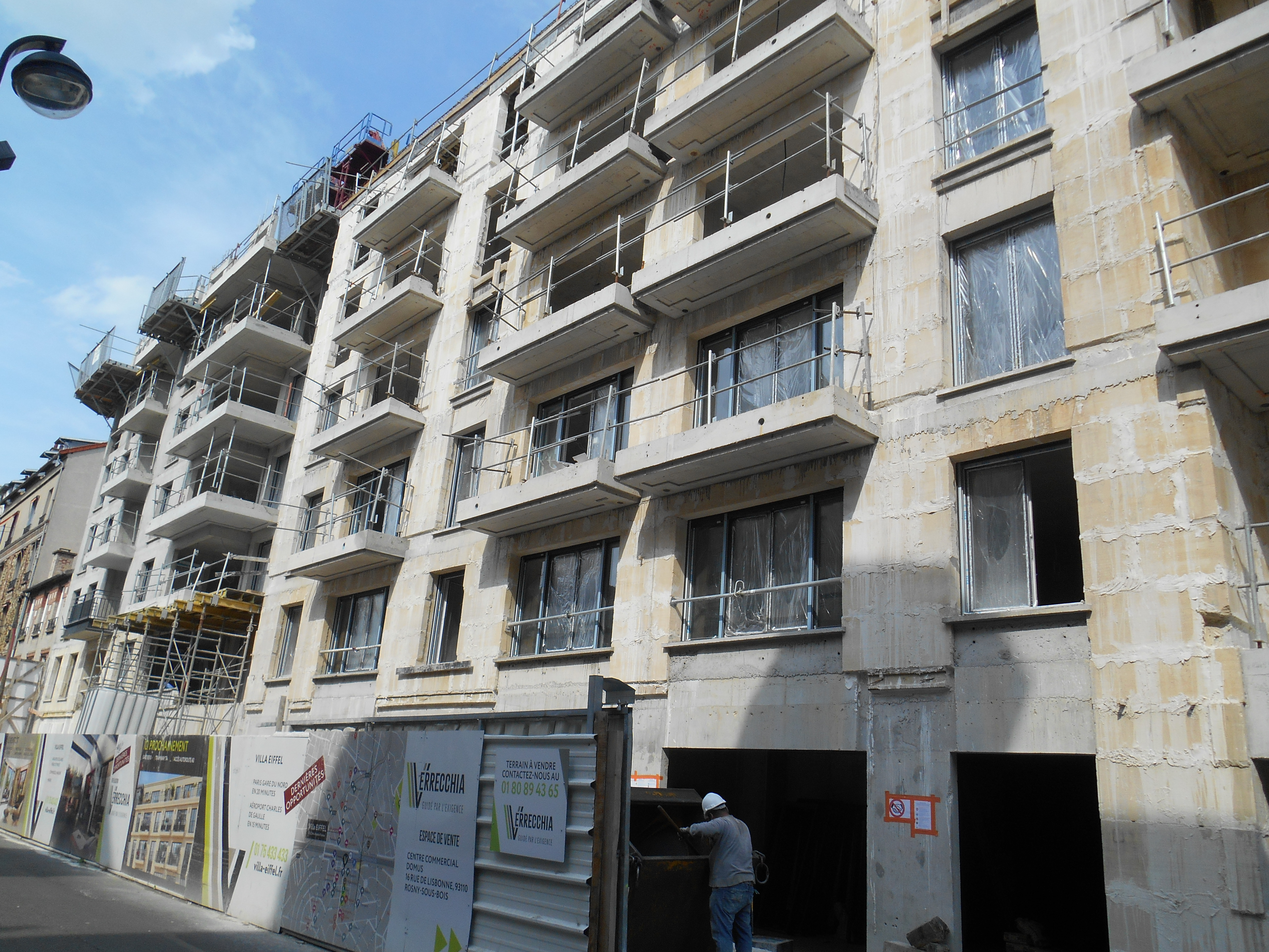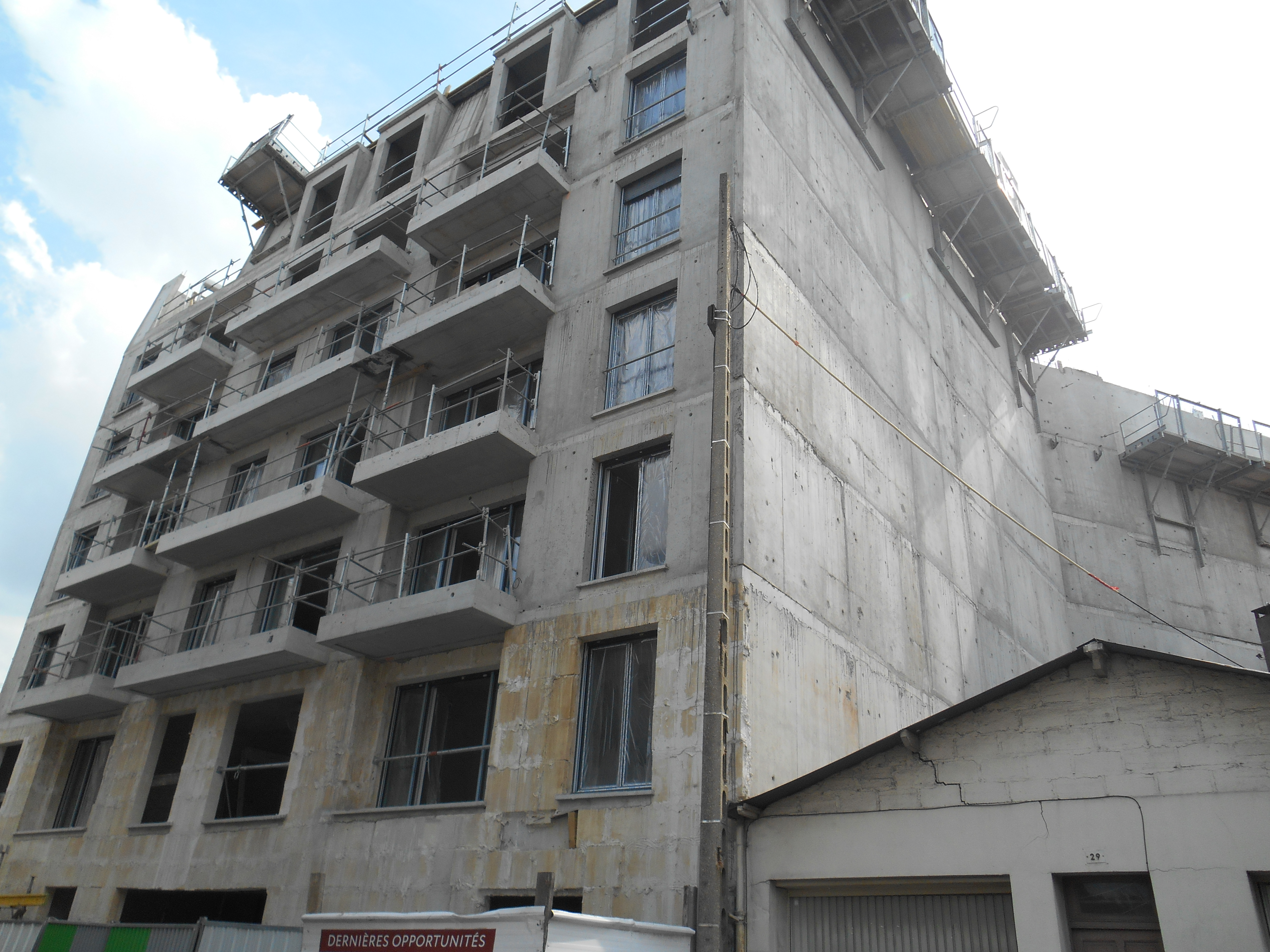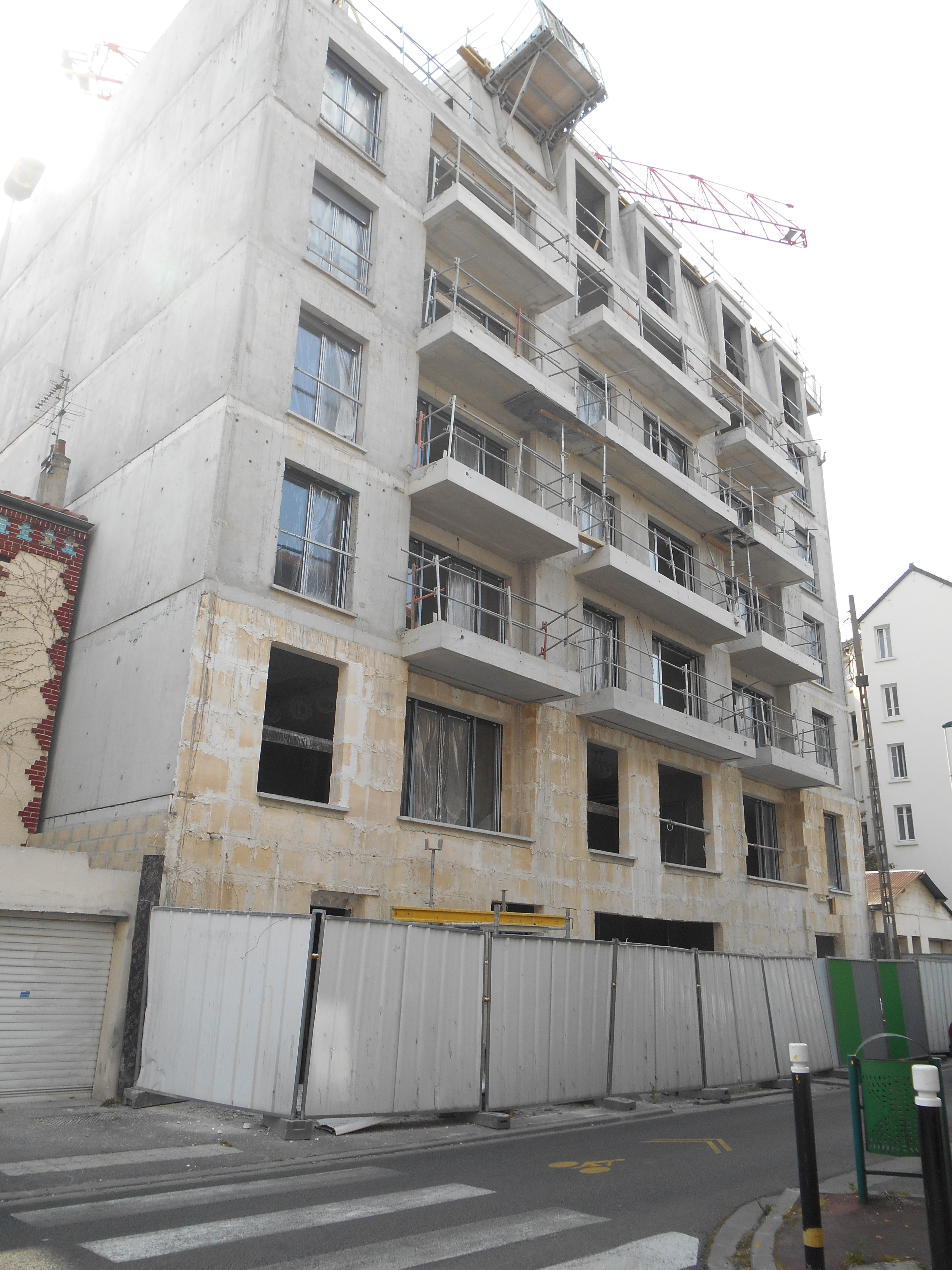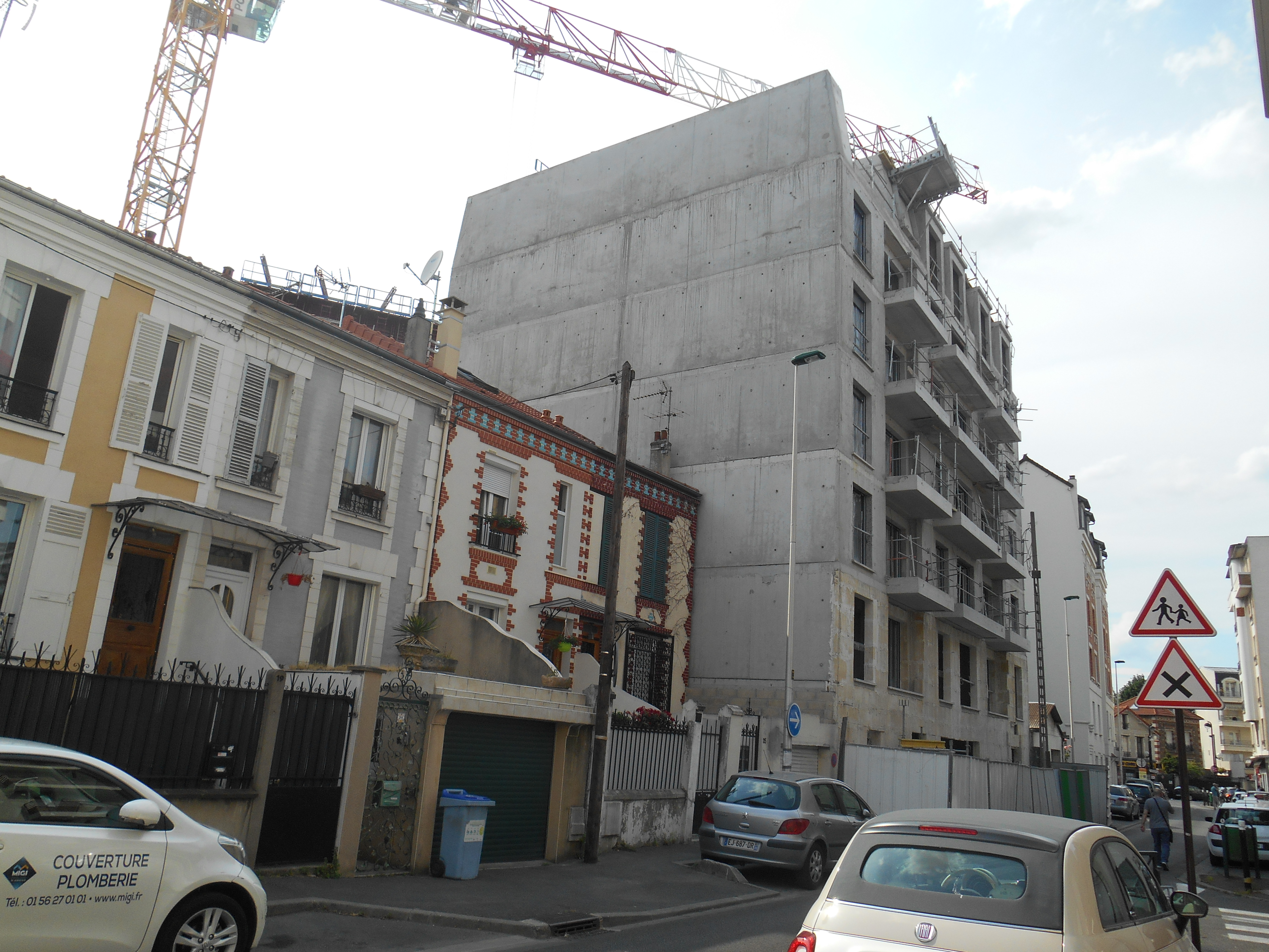 Sur la photo qui suit vous constaterez qu’en plus du non alignement de l’immeuble avec les pavillons existants, comme dans la rue Anatole France, les balcons surplombent le trottoir déjà bien étroit …. Les Aulnaysiens se sont pourtant exprimé sur le recul des constructions de la voie publique et sur le refus des balcons au dessus de l’espace publique !