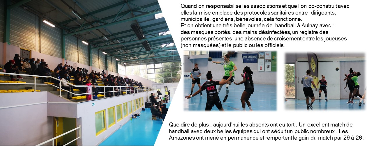 Ce fut une très belle journée dimanche dernier avec la victoire des amazones du Aulnay Handball. Mais ce qui est remarquable, c’est que le protocole sanitaire a été respecté comme le port du masque pour les joueuses du banc de touche, et l’application des consignes de la fédération de handball.