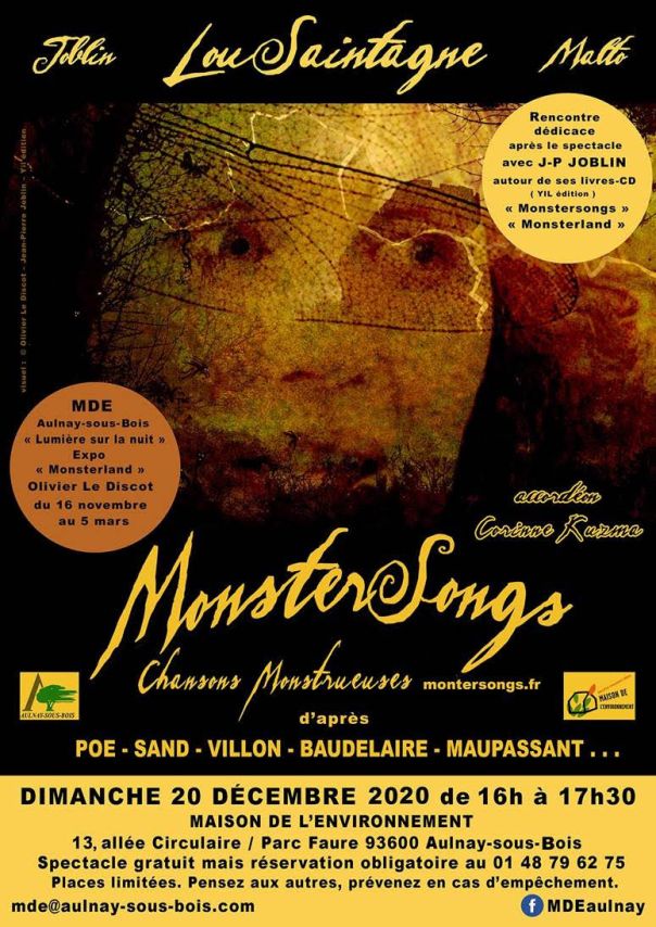 Le 20 décembre, de 16h à 17h30, la Maison de l’Environnement accueillera le spectacle « Monstersongs » interprété par Lou Saintagne https://www.youtube.com/watch?v=KZDKJam9Zz8&feature=youtu.be