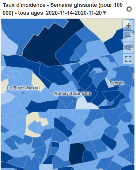 En effet, au vendredi 13 novembre 2020, quatorze communes avaient toujours un taux d’incidence compris entre 250 et 500 : Saint-Ouen, Pierrefitte-sur-Seine, Stains, Dugny, Le Bourget, Aulnay-sur-Seine, Villepinte, Tremblay-en-France, Sevran, Les Pavillons-sous-Bois, Bondy, Noisy-le-Sec, Rosny-sous-Bois, Gagny et Montfermeil.