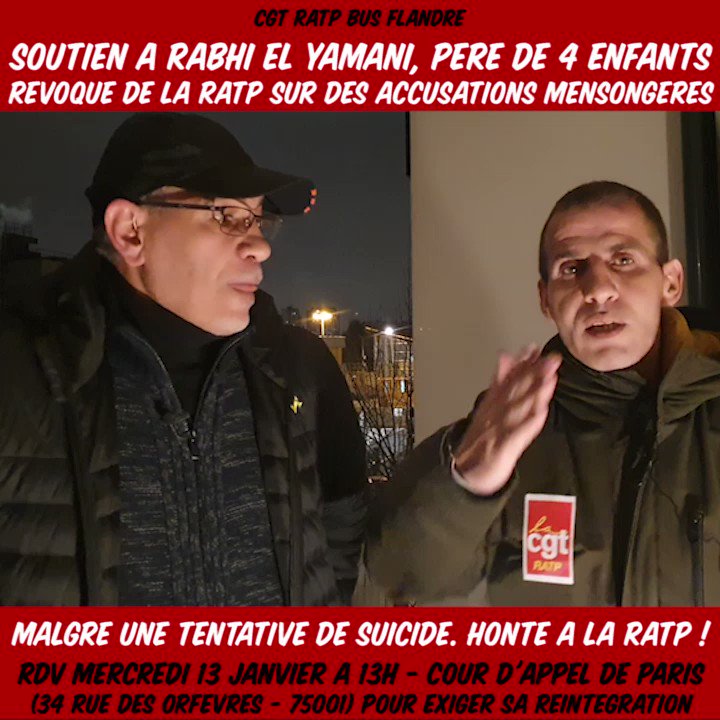 Ce mercredi 13 janvier à 13h à la Cour d’Appel de Paris (34 rue des Orfèvre – 75001 – Métros Cité, Châtelet), M. El Yamani tentera de défendre son dossier exiger sa réintégration à la RATP.