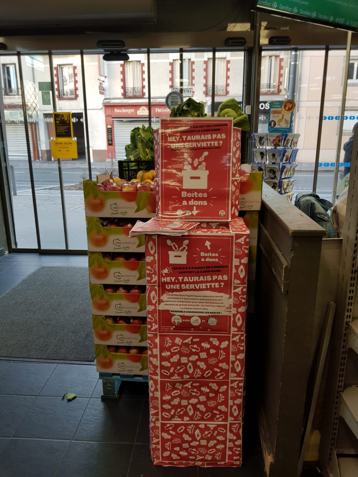 - Une campagne de collecte de protections hygiéniques sur toute la commune. Nous avons installé.e.s des boites à dons à Carrefour, Carrefour City, La Vie Claire, Monoprix, Franprix, Diagonal, Exotic Center. Nous voulons à la fois sensibiliser les Aulnaysien.ne.s à précarité menstruelle et récolter un maximum de protections hygiéniques pour les femmes en grande précarité. L’ensemble des dons sera redistribué à deux associations : Un Toît pour elles et la Chaine fratern’elles.