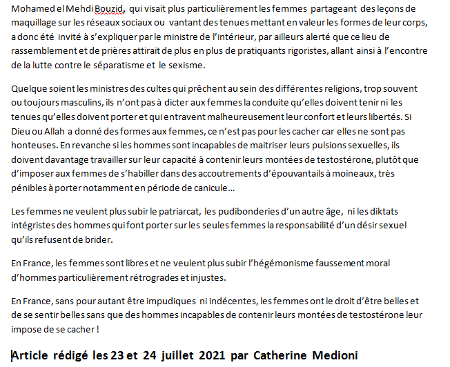 Décidément l’emprise des religions sur la vie des humains ne fait pas toujours bon ménage avec les lois de notre république laïque qui s’efforce de travailler à l’égalité hommes-femmes dans tous les aspects de la vie en société, à l’éradication du sexisme, du phallocratisme, du machisme, de la maltraitance et de la domination masculine prépondérante qui sont les marqueurs incontestables d’un monde envahi, voire cristallisé dans un patriarcat étouffant et d’un autre âge !