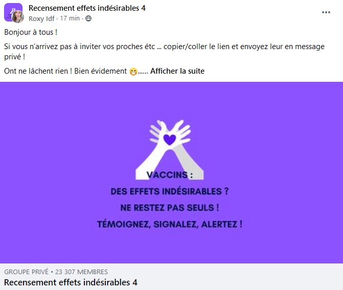 Enfin pour terminer sur note de résistance à la censure et à tout ce fatras de désinformation que nous subissons avec une extrême violence, durant le temps d’écriture de cet article, le groupe Facebook effets indésirables 4 s’est ouvert pour permettre aux vaccinés mécontents de leurs injections de pouvoir continuer à en témoigner ! Il subira probablement le même sort à plus ou moins brève échéance, ce qui donnera l’occasion de renaitre de ses cendres autant de fois que nécessaire pour que le droit d’expression soit respecté et non entravé par des moyens retors et malhonnêtes.
