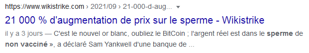 Un article publié sur cogito portant sur la recherche de sperme des non vaccinés et sur l’augmentation mécanique de leur prix parce qu’il se raréfie pour les PMA a été immédiatement supprimé de la toile ! il faut croire que ce genre d’information dans le désormais ex pays des droits de l’homme dérange au plus haut point…. Il est aussi une preuve factuelle que des autorités usent de tous leurs pouvoir pour empêcher la divulgation de ce type d’information qui démontre l’état d’esprit réel des citoyens vis à vis de cette vaccination imposée en laquelle ils n’ont aucunement confiance….