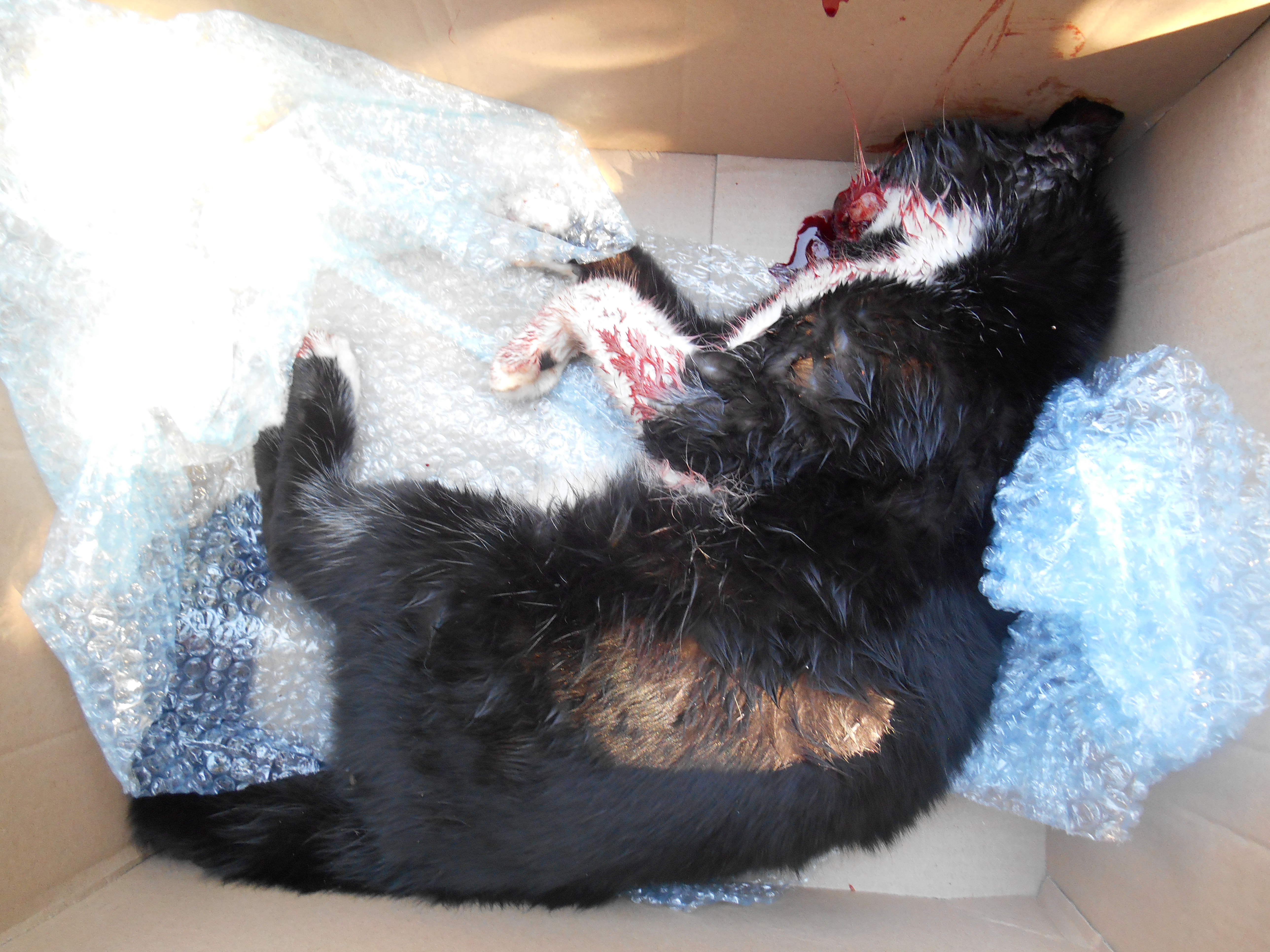C’est une dame riveraine qui, alertée par les mécontentements de voitures qui passaient dans cette rue et qui étaient gênées par ce pauvre cadavre de chat au milieu de la chaussée, nous l’a amené dans un carton….
