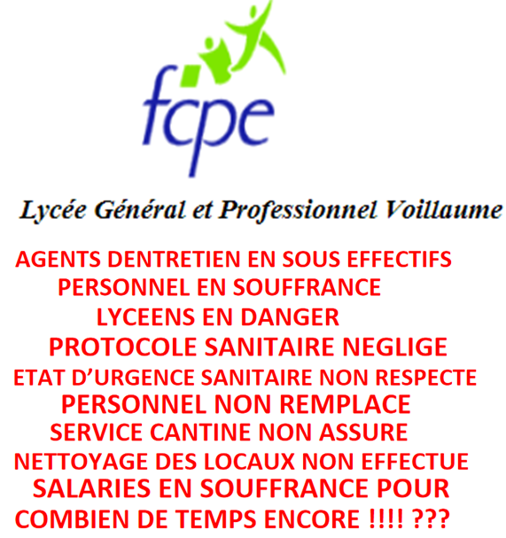 Les agents d’entretien soucieux d’effectuer leur travail dans les règles de l’art et conformément aux protocoles sanitaires en vigueur, sont découragés par l’ampleur du travail à effectuer chaque jour, lequel nécessite en urgence l’embauche d’au minimum 6 personnes. Ils ne comprennent pas que leurs alertes ainsi que celles des parents ne soient pas entendues et que le conseil régional qui a la responsabilité des lycées n’interviennent pas au plus vite !