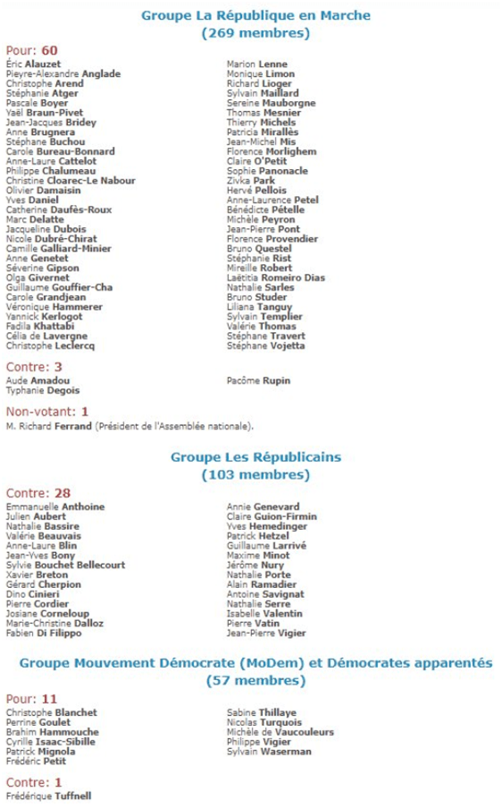 Ainsi,  pour le groupe La République en Marche qui comptabilise 269 membres, nous avons 64 présents dans l’hémicycle et 205 absents ! On ne sait point trop où ces absents sont allé marcher, mais en tous les cas, ils ne marchent pas pour le peuple ! Notons toutefois que 3 ont voté contre….
