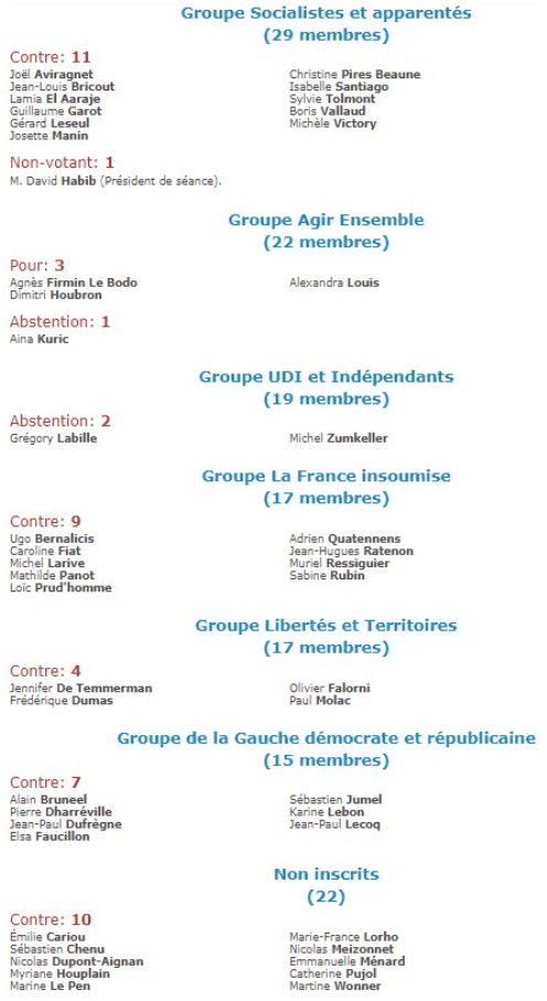 Le groupe classé  » non inscrits  » comporte 22 membres et présentait 10 députés qui ont tous voté contre.