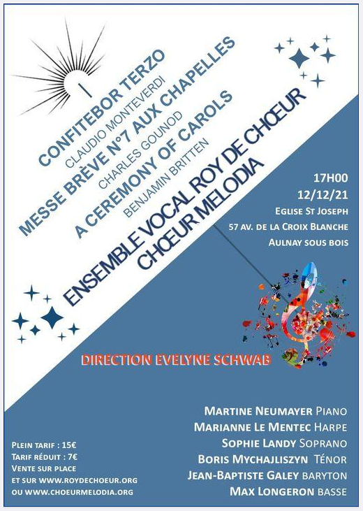Monteverdi, Gounod et Britten interprétés par L’ensemble vocal Roy de Chœur et le Chœur Melodia dirigés par Evelyne Schwab le 12 décembre 2021 à 17 heures en l’église Saint Joseph