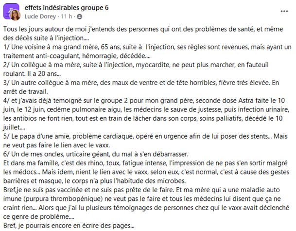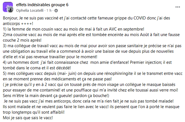 Les effets dramatiques de la vaccination courageusement dénoncés par Eric montana, mais également par des soignants et des vaccinés eux-mêmes, sont consultables sur un groupe Facebook déjà 5 fois censuré, ce qui prouve bien que nos autorités, Macron et Véran qui imposent l’obligation vaccinale, ne tiennent pas du tout à ce que les citoyens soient informés réellement des risques qu’ils prennent et qu’ils encourent en acceptant de se faire injecter ! Si ce n’était pas le cas , jamais ce groupe n’aurait été déjà 5 fois censuré !