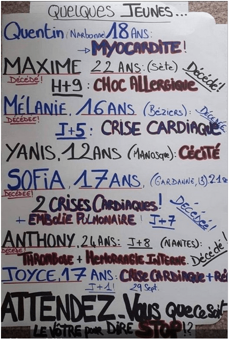 – 1° remarque concerne 2 prénoms qui apparaissent dans la photo que vous publiez (Sofia et Yanis). Ces 2 cas sont repris dans le rapport de L’ANSM. Les analyses sont toujours en cours. Vous avez tous loisir d’en informer les lecteurs. La prochaine mise à jour devrait avoir lieu Jeudi ou vendredi. A suivre.