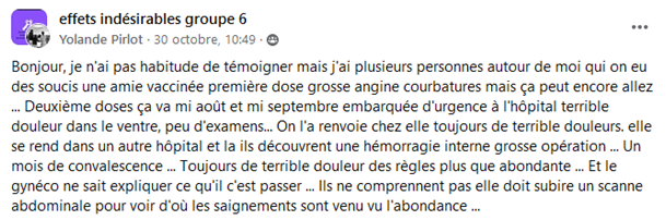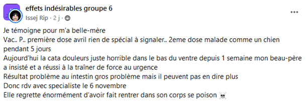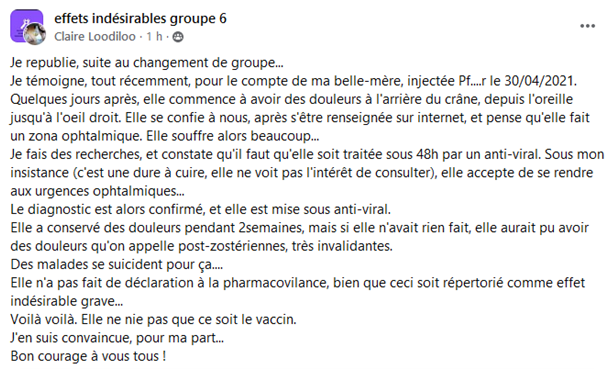 Les effets dramatiques de la vaccination courageusement dénoncés par Eric montana, mais également par des soignants et des vaccinés eux-mêmes, sont consultables sur un groupe Facebook déjà 5 fois censuré, ce qui prouve bien que nos autorités, Macron et Véran qui imposent l’obligation vaccinale, ne tiennent pas du tout à ce que les citoyens soient informés réellement des risques qu’ils prennent et qu’ils encourent en acceptant de se faire injecter !  Si ce n’était pas le cas , jamais ce groupe n’aurait été déjà 5 fois censuré !