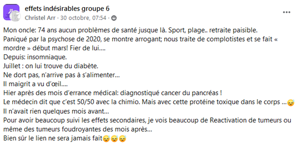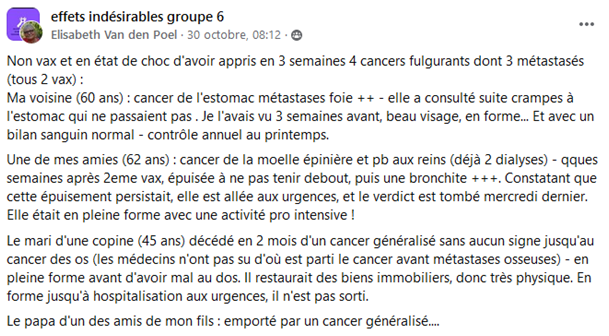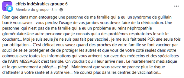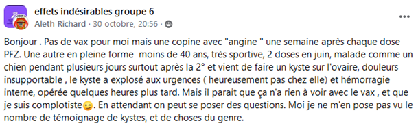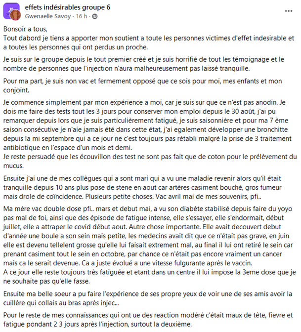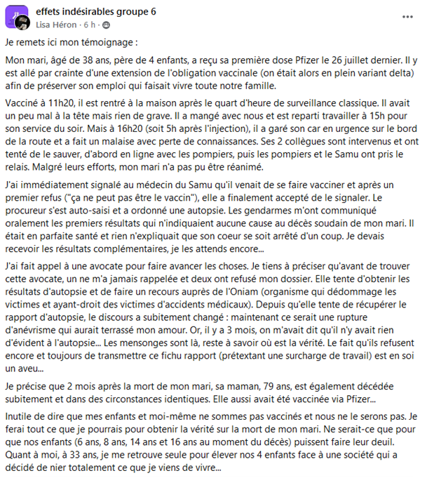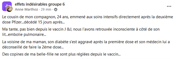 Encore et toujours ce manque de culture médicale et scientifique. Tous les jours 0.0021% de la population française meurt! Actuellement, il y a 125 000 injections/j de vaccins contre le covid 19. Statistiquement, il y a tous les jours 2.59 personnes vaccinées qui vont décéder. On n’y peut rien. Cela n’est pas lié au vaccin. Pour les effets indésirables aussi, il y a une certaine proportion des pathologies observées qui surviennent spontanément sans que l’on soit vacciné. Mais comme vous préférez le côté simpliste du «Après cela, donc à cause de cela», vous ne pouvez pas imaginer qu’il existe d’autres causes et vous publiez les témoignages souvent bidonnés des groupes facebook.